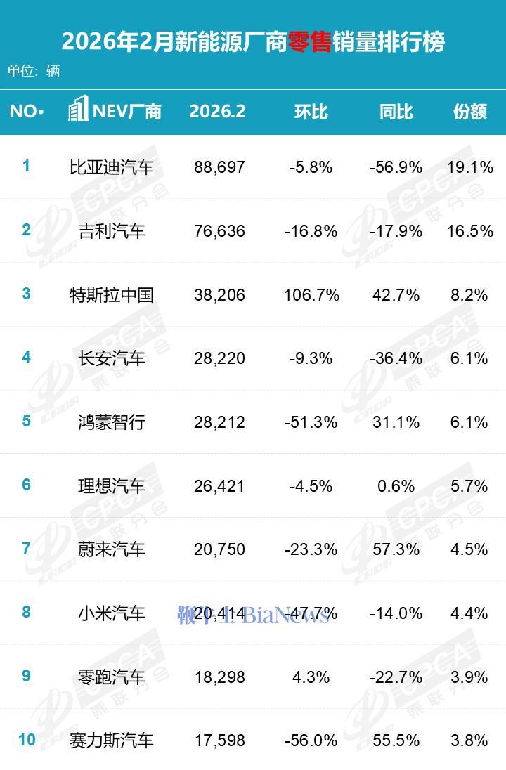 2月,比亚迪继续坐稳中国最大新能源汽车制造商的位置,特斯拉则重返新能源汽车零售销量榜前十,并跻身前三。