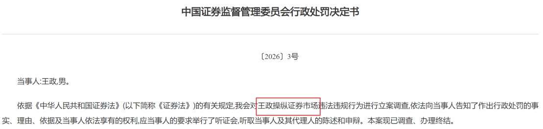 值得一提的是,证监会〔2026〕1号《行政处罚决定书》也指向操纵市场。