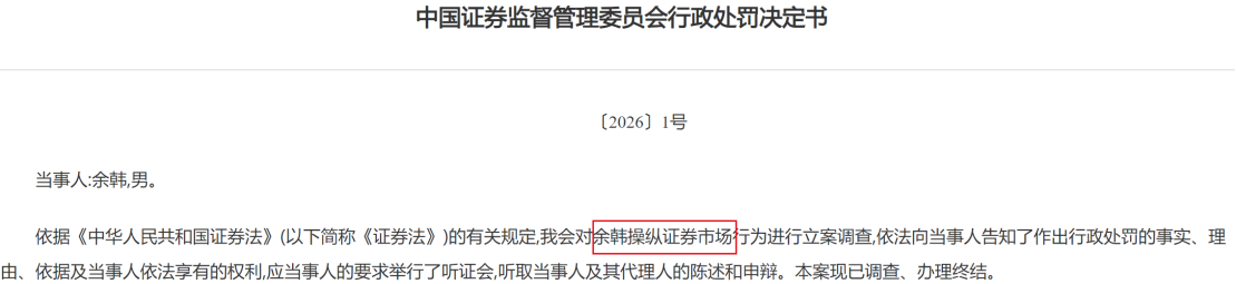 值得注意的是,证监会〔2026〕1号罚单也开给了操纵证券市场的当事人,余韩被“没一罚一”罚没10.22亿元,并被采取“证券市场禁入+证券市场禁止交易”的“双重禁入”措施。