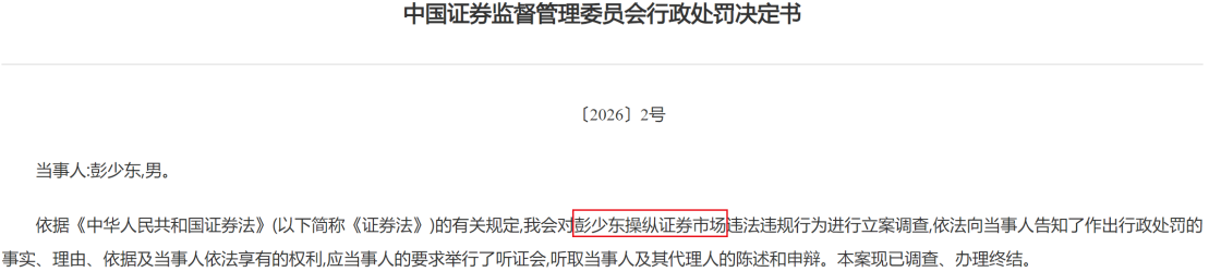 证监会官网显示,近日公布的证监会〔2026〕2号、3号《行政处罚决定书》分别指向操纵证券市场的彭少东、王政。